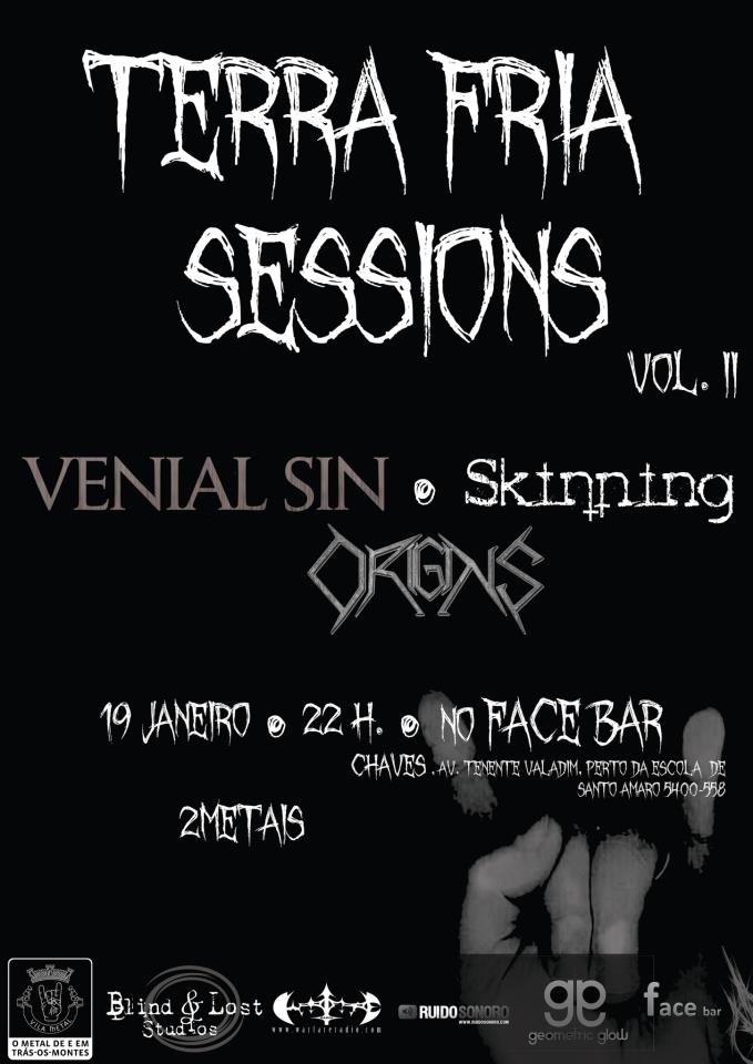 Terra Fria Sessions II com VENIAL SIN + SKINNING + ORIGINS Eventos 12 de Dezembro de 2012 VENIAL SIN + SKINNING + ORIGINS (Terra Fria Sessions vol.II) Face Bar, Chaves – Início 22 horas – Entrada são 2 metais