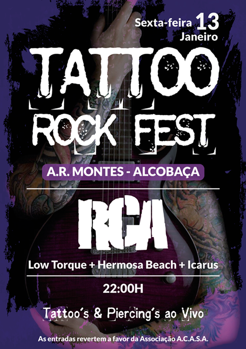 A primeira sexta-feira 13 do ano, já neste mês de Janeiro, testemunhará o Tattoo Rock Fest, evento que aliará a música à demonstração ao vivo de tatuagens e piercings e ainda à solidariedade. Com o palco montado nos Montes, em Alcobaça, serão quatro os nomes que o irão pisar: RCA, Low Torque, Hermosa Beach e Icarus.
