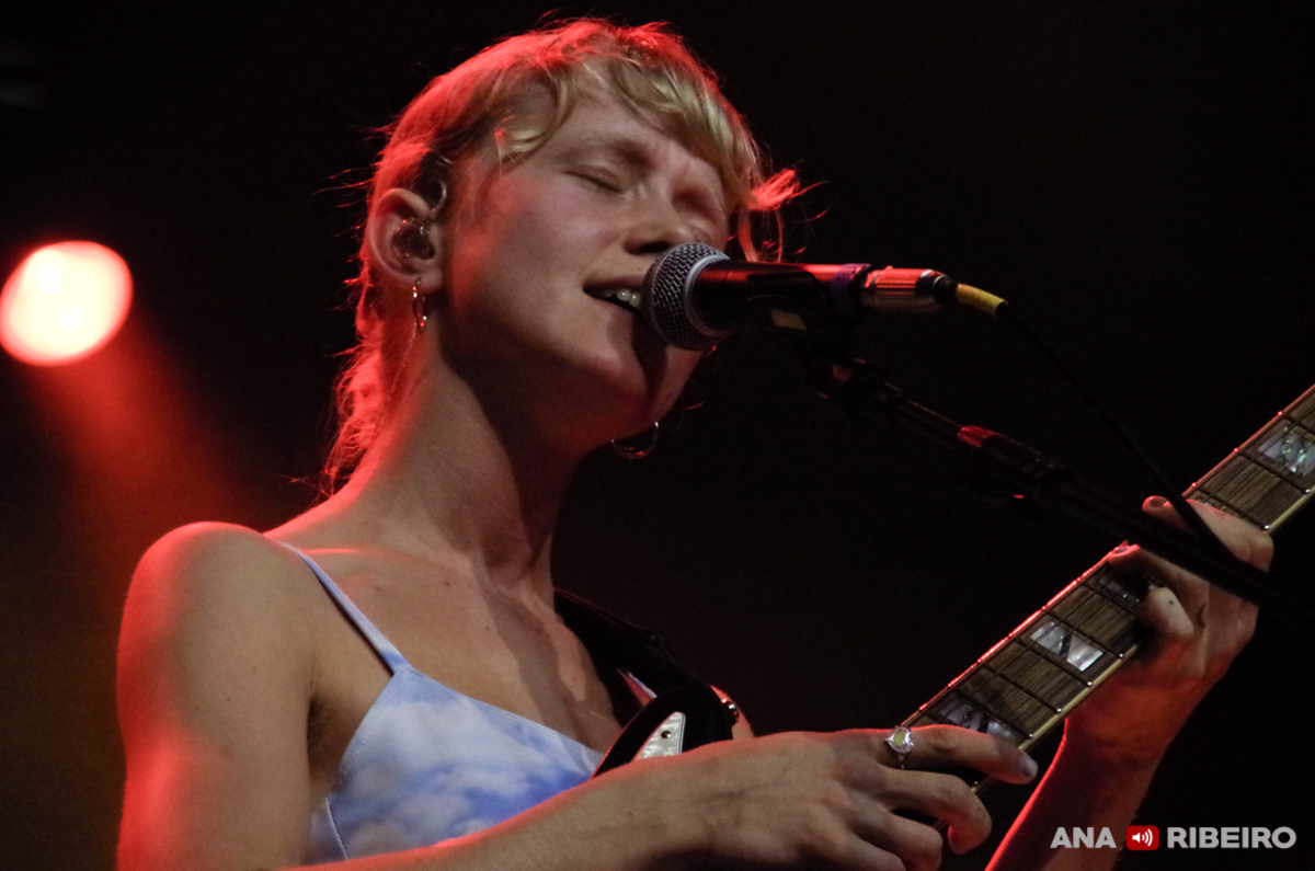 O público ‘hipster-good-behaviour’ transmite uma pacífica vontade de estar, ouvir, beber e conviver, pois ali as restrições ficaram à porta: sem máscara, sem lugares marcados, bar disponível com copos reutilizáveis. Num instante parece que tudo voltou a ser como antes. Às 22h surgiu uma pequena e enérgica fada saltitante, transportando gloriosamente a sua guitarra azul brilhante. Com várias dezenas de pessoas efusivas na recepção da banda, Alice Phoebe Lou sorriu e explicou ser o regresso após algum tempo de pausa para férias. Por detrás daqueles cabelos loiros e figura frágil de 28 anos quase que nos deixamos enganar, ou não fosse a sua ginga de ombros a acompanhar os seus ritmos e letras de quem já viveu vários (des)amores.